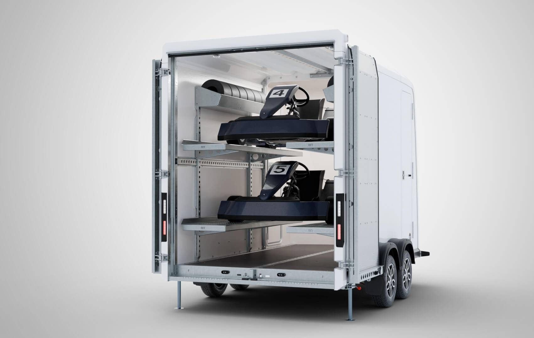 Remorque PREMIUM avec pléthore d'équipements de série : Portes Arrières Multifonction (ouverture en hayons, ou latéralement), 2 Portes d'Accès Piéton gauche et droite, Multiples Points d'Arrimage au sol, Rail Périphérique d'Arrimage à mi-hauteur (sauf si la remorque est équipée de grandes portes latérales), Éclairage Extérieur LED intégral, Éclairage Intérieur par 4 spots LED (énergie solaire), Roue de Secours, 5x Jantes en Alliage, Verrou d'attelage, 2x Béquilles Arrière.......